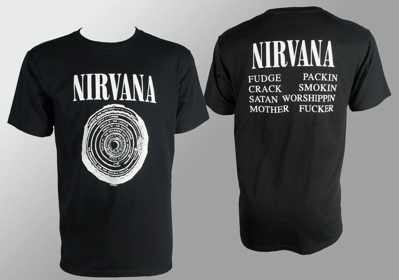 The smiley face was just one of Nirvana’s ways to get people to open their minds and maybe think before wearing something. I had a collection of over 30 Nirvana shirts which I can’t remember ever giving away and I wonder why this one- Dante’s circle of hell hasn’t become the stupid status symbol that the other has: